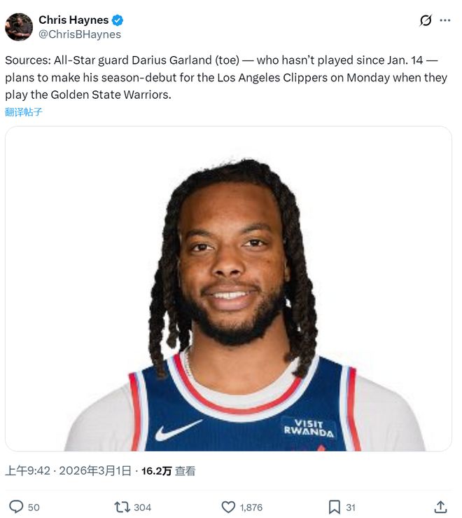 据名记Chris Haynes报道,达里厄斯·加兰将在3月3日对阵勇士的比赛中迎来快船生涯首秀。过去一个半月,他一直在处理脚趾伤势,交易截止日被送到快船后,一场没打。